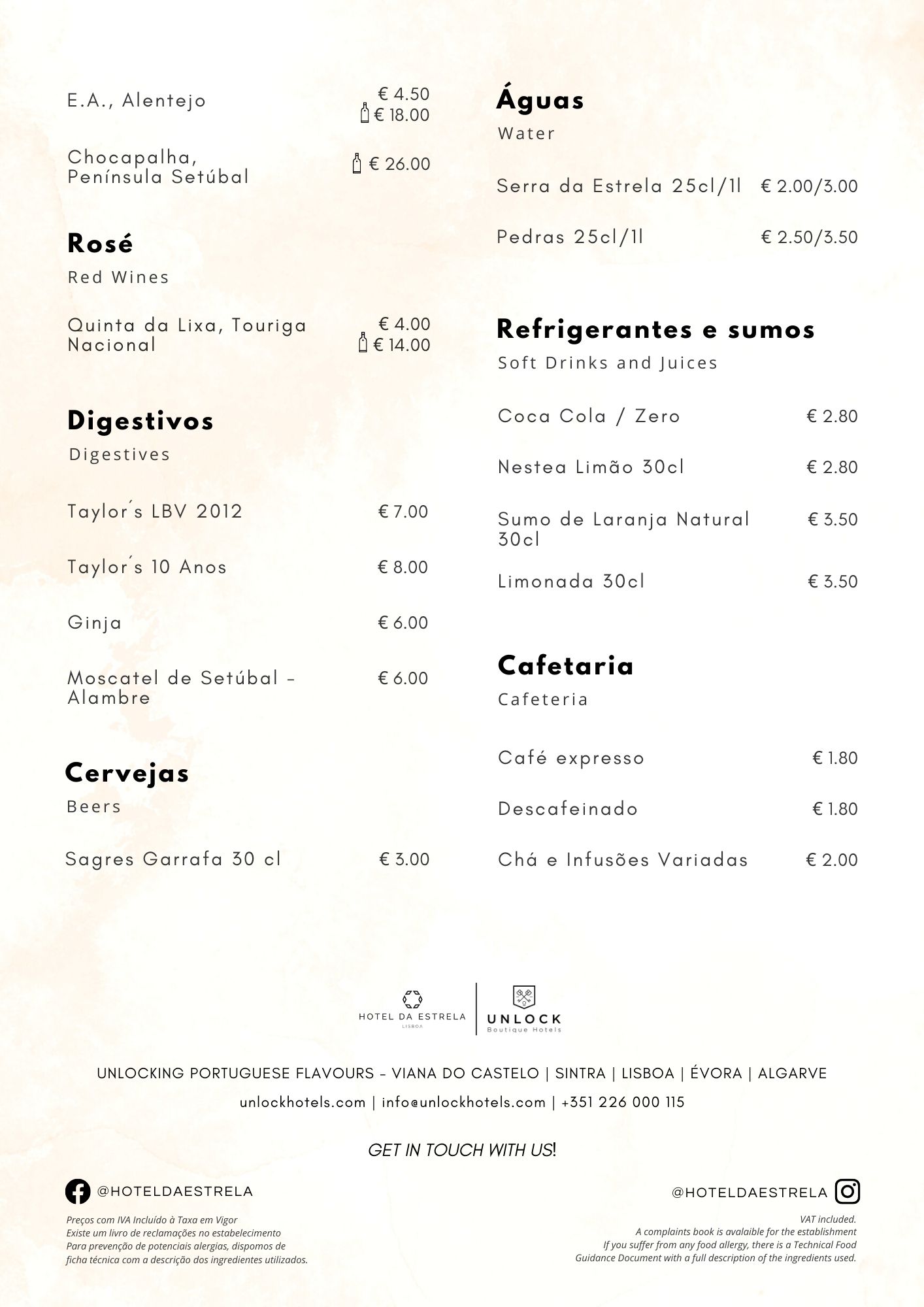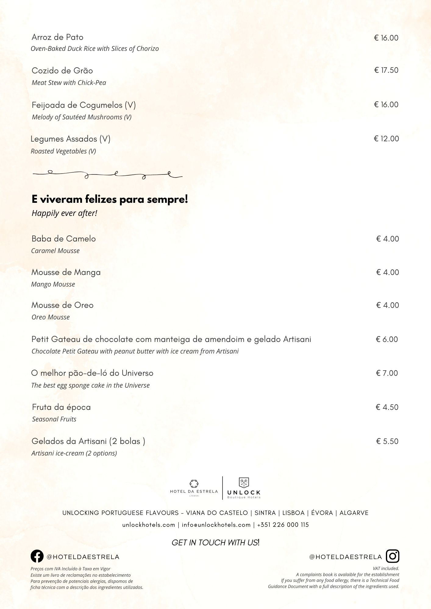 Preços com IVA Incluído à Taxa em Vigor Existe um livro de reclamações no estabelecimento. Para prevenção de potenciais alergias, dispomos de ficha técnica com a descrição dos ingredientes utilizados.